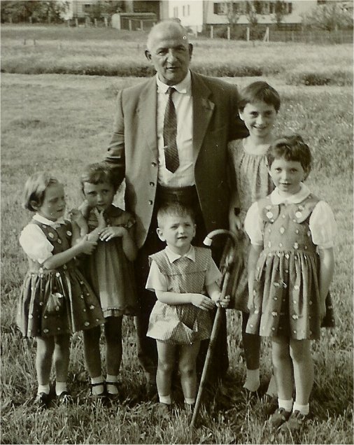 Bild 5 Spazieren mit Großnichten und Großneffe von links: Barbara, Franziska, Ulrich, Christine und Gabi, etwa 1958 in Bischofsmais
