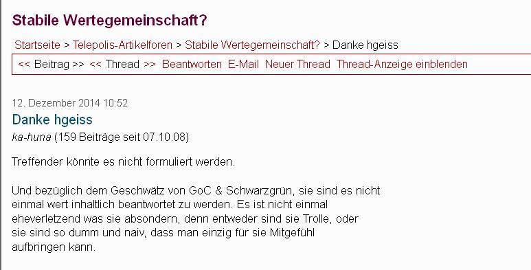 9.12.2014 Immer noch Wertegemeinschaft mit den USA, Frau Merkel? Gedanken zum CIA- Folter-Bericht Wer jetzt noch immer nicht den Kopf aus dem Sand zieht, die rosarote Brille und die Scheuklappen in die Eckes schmeißt, der hat den Kopf gar nicht im Sand, hat gar keine rosarote Brille auf und keine Scheuklappen. Dann bleibt nur die Frage, ist er Mitläufer oder Komplize? Wird er gelockt oder getrieben? Also, ist er gekauft oder wird er erpresst? Doch wer das Offensichtliche ausspricht ist ein Verschwörungstheoretiker, sagen die Verschwörungspraktiker. PS: In einem Blog wurde an die Folter deutscher Kriegsgefangener auf den Rheinwiesen durch die USA hingewiesen. Dazu will ich berichten, was ich von meinem verstorbenen Vater darüber weiß: Mein Vater war erst 17 Jahre, als er dort bei Kälte und Nässe praktisch ohne Verpflegung ohne jede Behausung mit Tausenden anderen eingesperrt wurde. Er überlebte abgemagert und schwer krank und lief nach der Entlassung 500 km zu Fuß nach Hause.. Er erzählte nur ein einziges Mal von der Tortur, da war ich schon erwachsen. Es habe täglich nur ein winziges Stück Brot und eine Wassersuppe gegeben. Hätte ihm nicht ein GI durch den Zaun manchmal Zuckerstücke zugesteckt, hätte er nicht überlebt. Um sich vor der Kälte zu schützen, habe man sich eingegraben, was verboten war. Wachsoldaten versuchten das zu unterbinden, in dem sie mit schweren Fahrzeugen über die Eingegrabenen wegfuhren, was für etliche den Tod bedeutete. Was mußte es für meinen Vater für Gefühle gewesen sein , dass ich als Nachkriegskind die Amis verherrlichte, ihre Lieder sang und mich von ihren Comics und Filmen verblöden ließ. Antwort auf zwei Poster, die mir Nazitum vorwarfen. 12. Dezember 2014: Die Phrase: "Folter, das geht gar nicht", Frau Kanzlerin, genügt nicht. Wenn man alles, was einem nicht ins einfältige Weltbild passt,