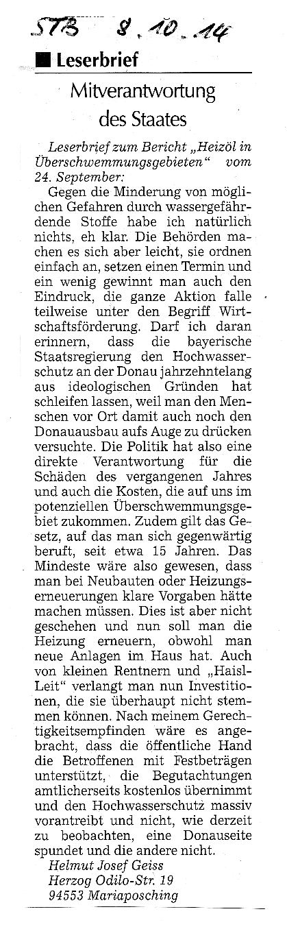 Originalschreiben, Leserbrief zu verwandtem Thema