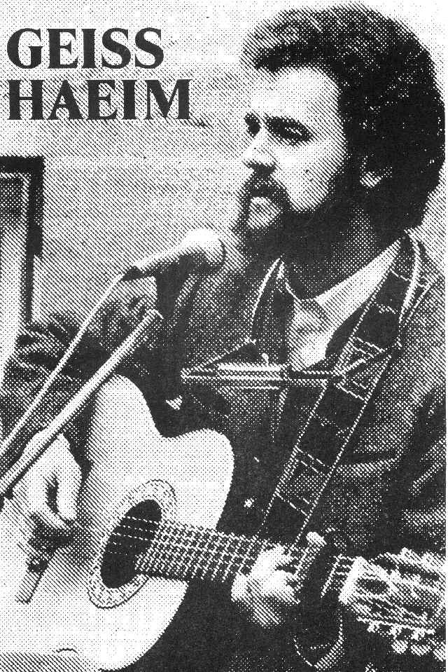 Geiss Haejms ©Hirnbatzl, LP von 1981 Musik und Text: Helmut Josef Geiss, Alle Rechte beim Autor! Nach der "Reise ins Schlaraffenland" und den "Vozwickten Mundartsongs" von 1979 war die LP "Hirnbatzl" von 1981 meine erste, wirklich reife Produktion , an der ich auch heute nicht viel auszusetzen finde. Alle Titel habe ich zu Hause auf einem TEAC-4 Spurband aufgenommen und dann in einem professionellen Studio, bei Andi Marx in Unterschleißheim abmischen lassen. Marx veranlasste mich, die beiden Lieder "Da Haiptling" und "Entwicklungen" ein wenig zu "versalonbayrischen", was gewiss ein Fehler war. Die beiden Titel wurden im Studio mit professionellen Musikern aufgenommen und von Marx abgemischt, beim "Haiptling" mit allerlei Klamauk, was ich damals furchtbar fand, heute aber ganz lustig finde. Der "Häuptling" wurde von Marx auch mit einem köllschen Text versehen und sollte auf einer Arcade-LP im großen Stil vermarktet werden, leider machte die Firma gerade pleite und so wurde es wieder einmal nichts mit Tantiemen... Die köllsche Version erschien auch als Single.Die LP "Hirnbatzl" wurde auch zum Türöffner beim Nürnberger Bardentreffen, an dem ich 1980 schon einmal teilgenommen hatte. So wurde ich 1983 erneut eingeladen und durfte im Folgejahr das Bardentreffen sogar eröffnen.