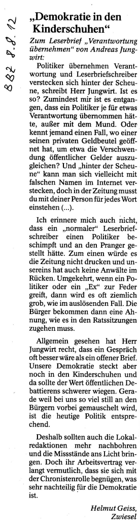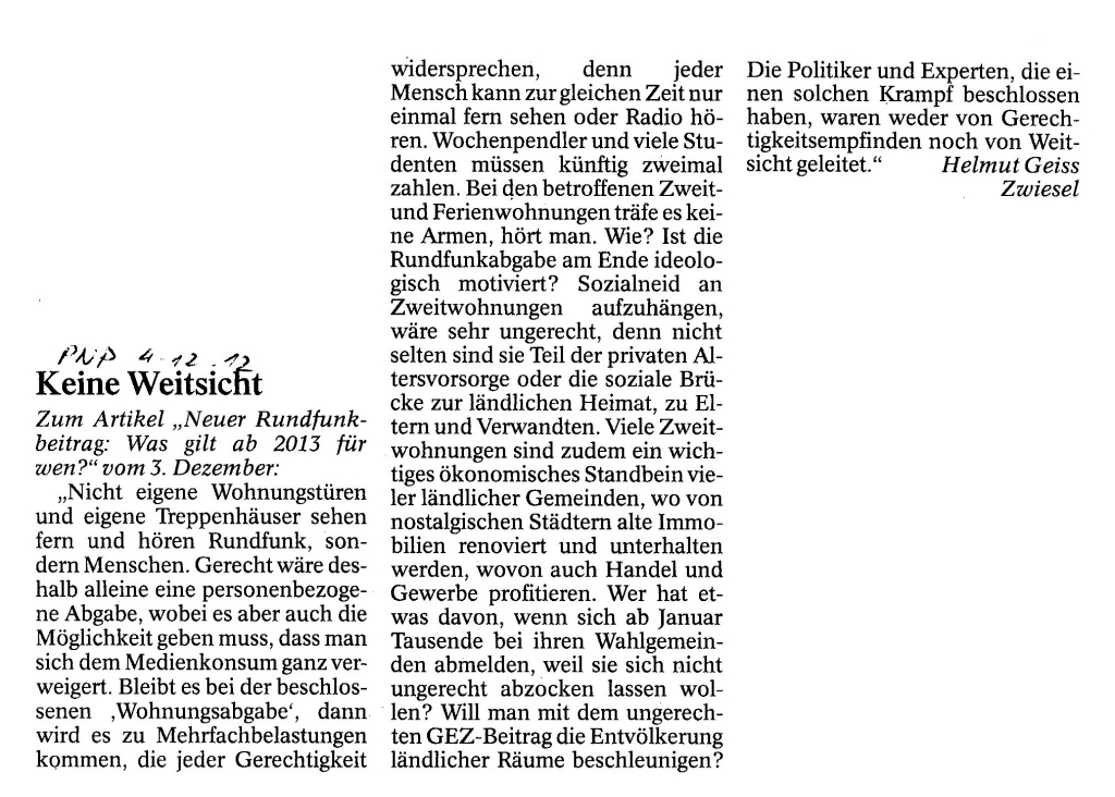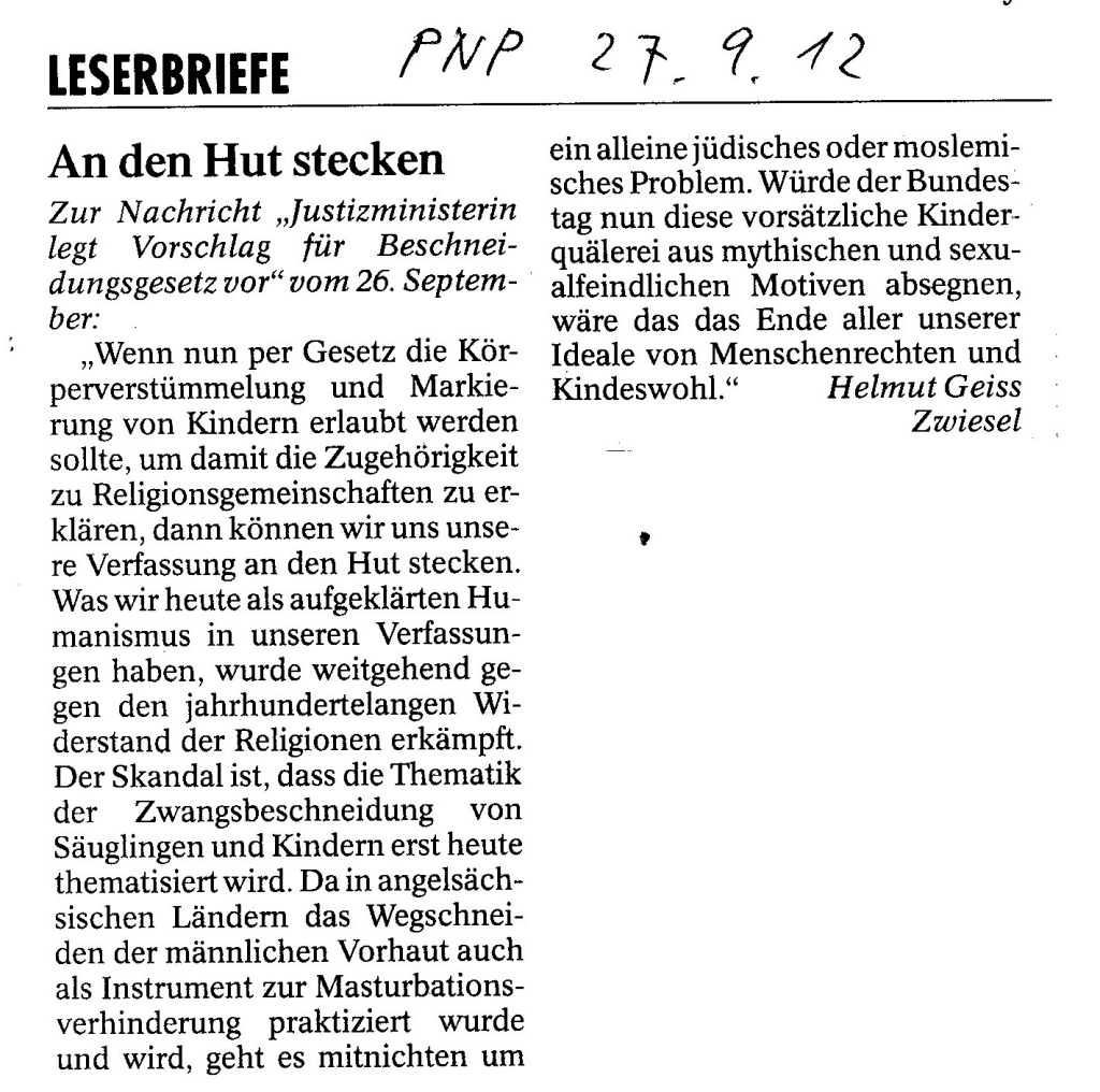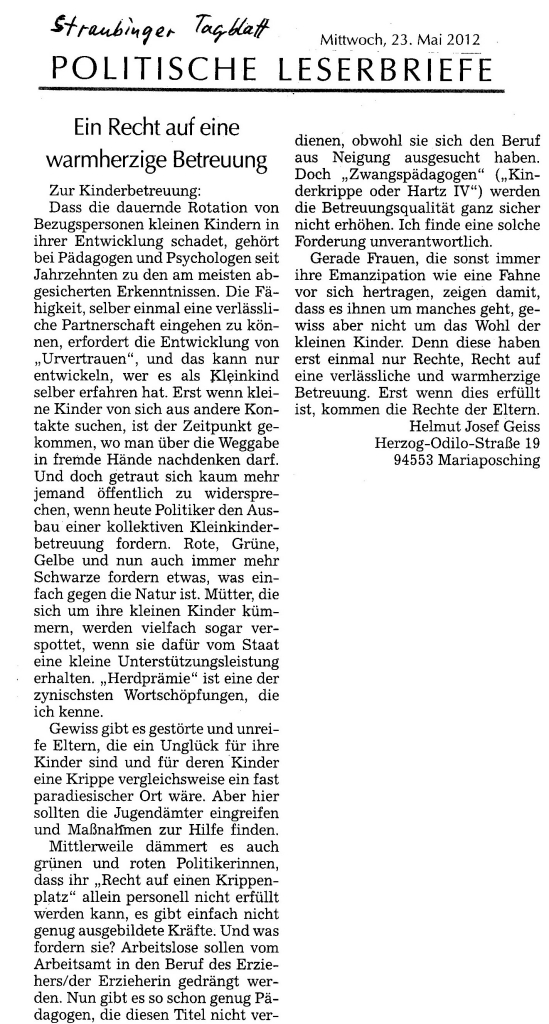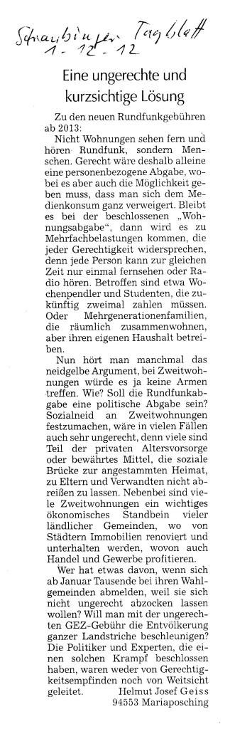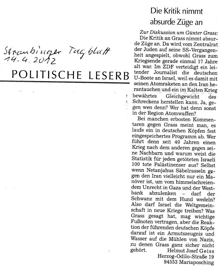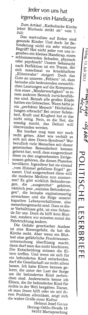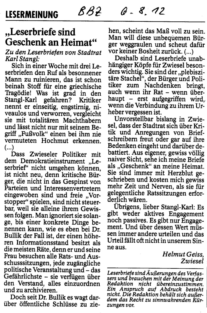 Helmut Josef Geiss - Original-Leserbriefe von 2012